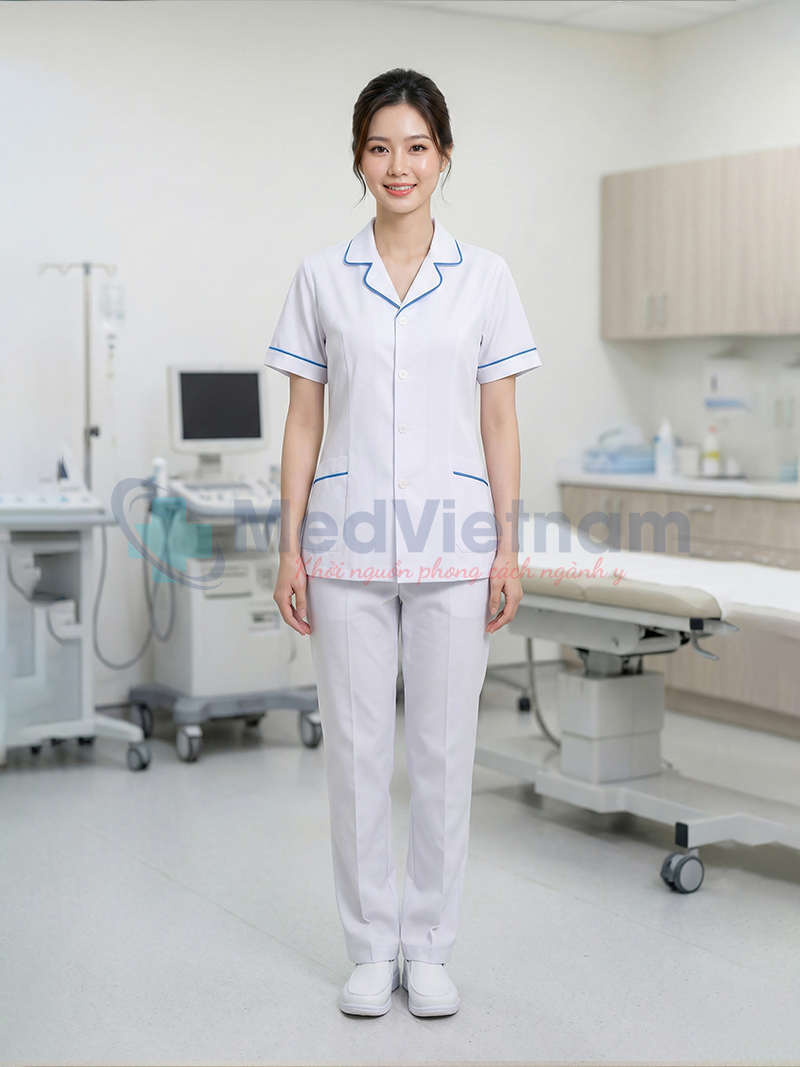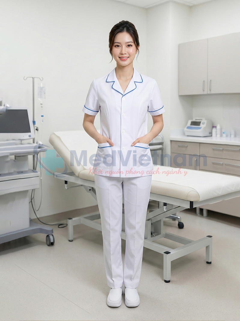 Áo blouse trắng cộc tay dành cho điều dưỡng, y tá nữlà mẫu đồng phục y tế được thiết kế phù hợp với môi trường bệnh viện và phòng khám, nơi yêu cầu cao về sự sạch sẽ, chuyên nghiệp và thoải mái trong suốt ca làm việc.