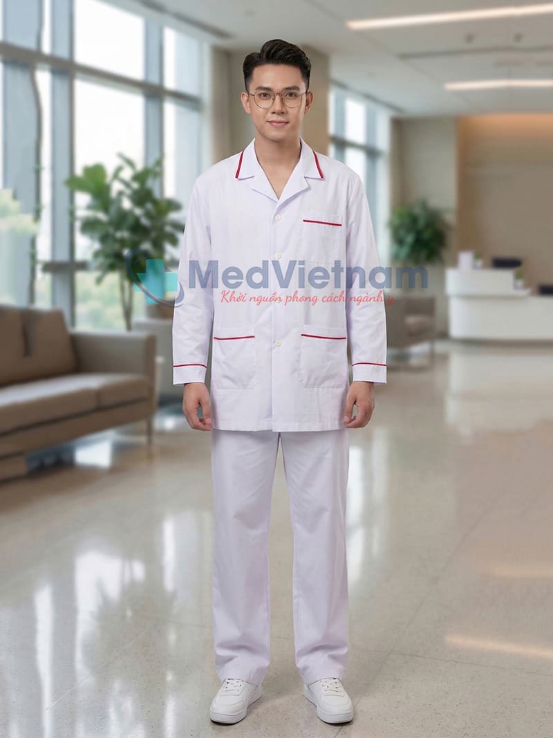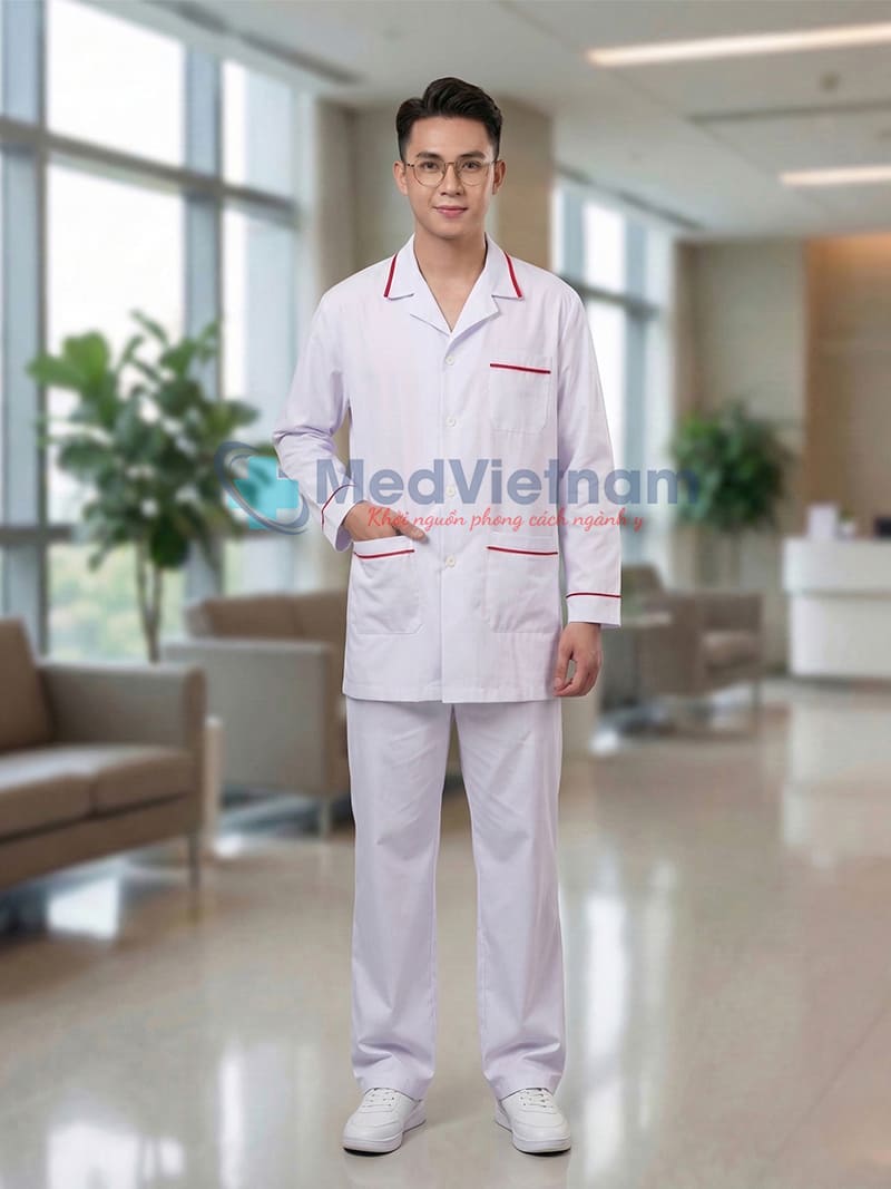 Điểm nhấn của sản phẩm nằm ở đường viền đỏ tinh tế ở cổ áo, túi áo và tay áo. Chi tiết này không chỉ tạo nét thẩm mỹ nổi bật mà còn giúp bộ đồng phục trở nên chuyên nghiệp và dễ nhận diện hơn trong môi trường y tế.