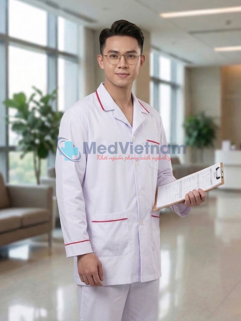 Sản phẩm: Áo blouse y tá, điều dưỡng nam dài tay màu trắng viền đỏ, Size M