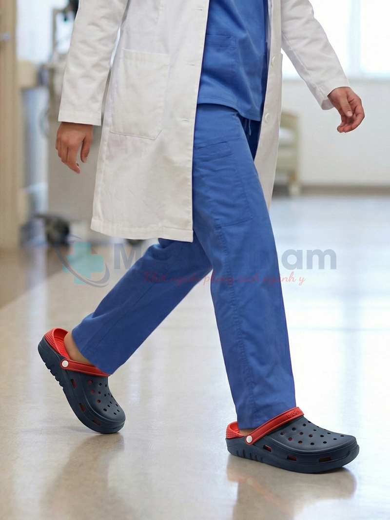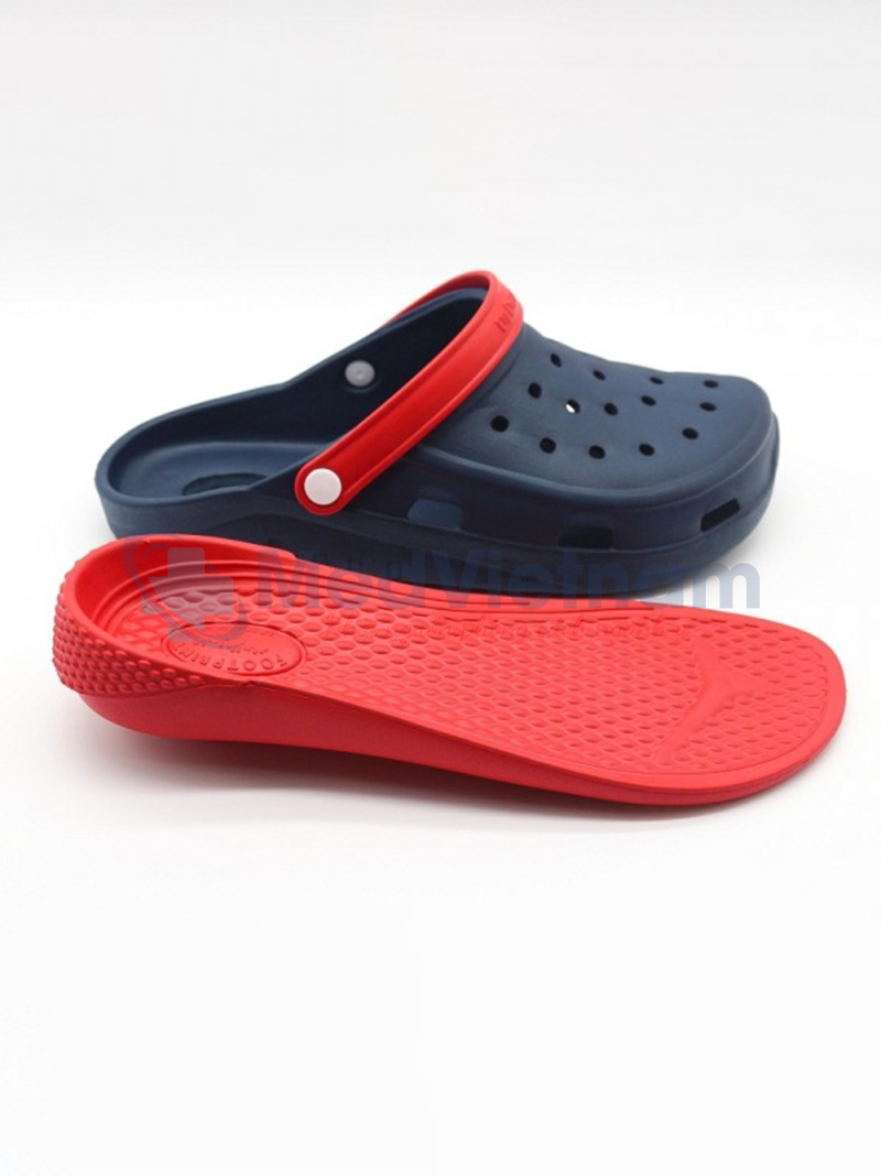 Phần đế dép được thiết kế với bề mặt ma sát cao, giúp chống trơn trượt hiệu quả trên các bề mặt trơn ướt thường gặp trong bệnh viện, phòng khám và phòng sạch. Cấu trúc đế dày kết hợp khả năng giảm chấn tốt, hỗ trợ bảo vệ khớp chân, gót chân và cột sống khi di chuyển nhiều.