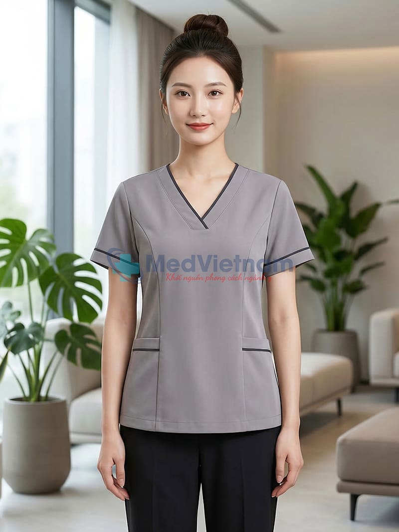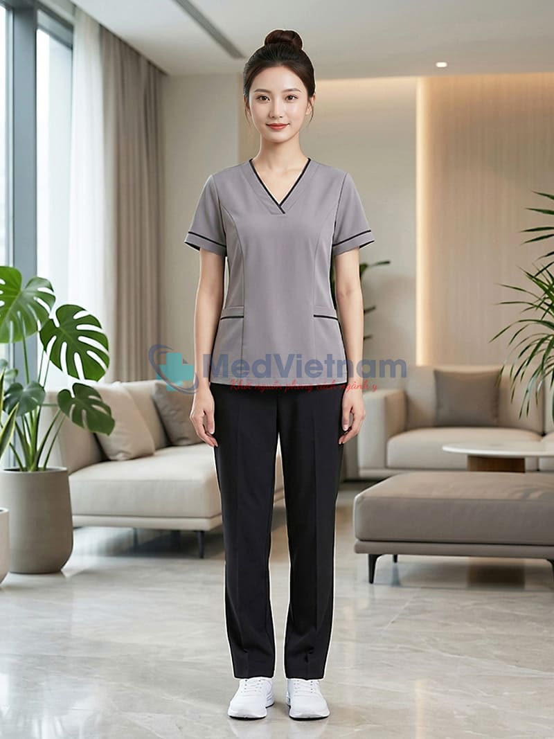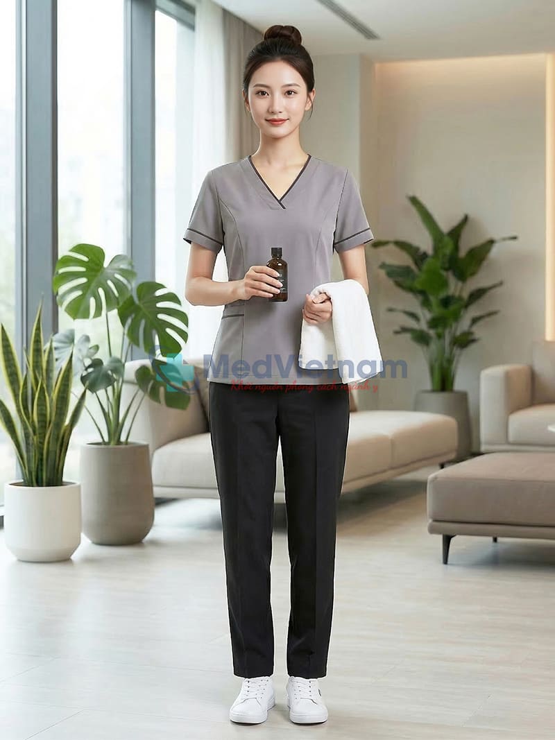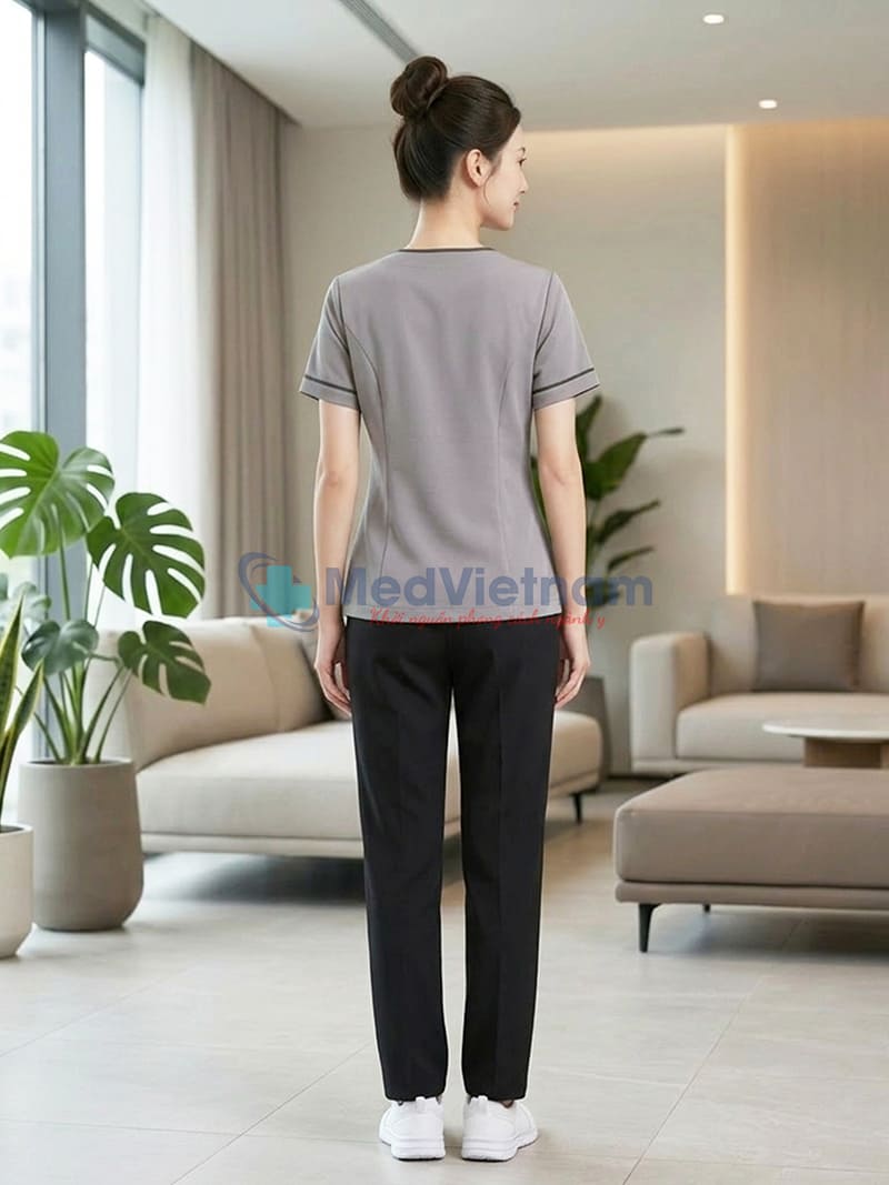 Sản phẩm: Đồng phục spa nữ màu xám viền đen vải cotton, thiết kế chuyên nghiệp, Size M