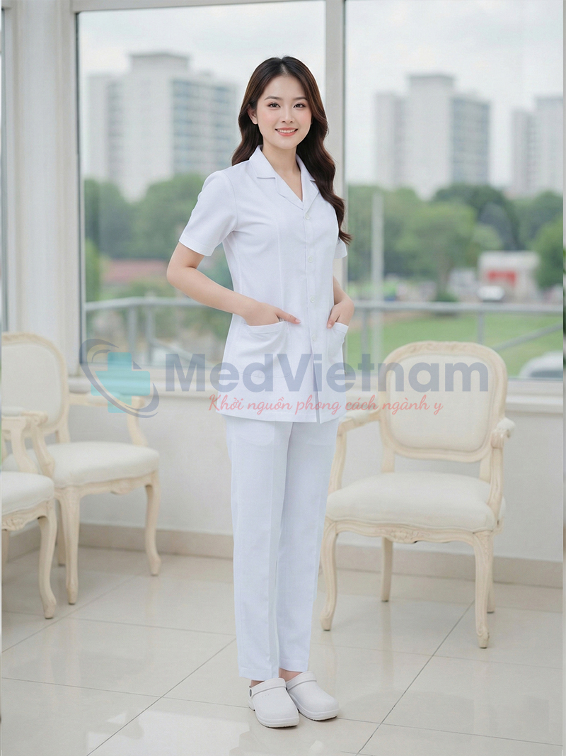Đồng phục y tá, điều dưỡng nữđược thiết kế theo phong cách tối giản, tinh tế, tôn lên vẻ gọn gàng, chuẩn mực nhưng vẫn mềm mại và dễ chịu trong suốt ca làm việc dài. Màu trắng thuần khiết mang lại cảm giác sạch sẽ, chuyên nghiệp, phù hợp với môi trường y tế như bệnh viện, phòng khám, spa chăm sóc sức khỏe.